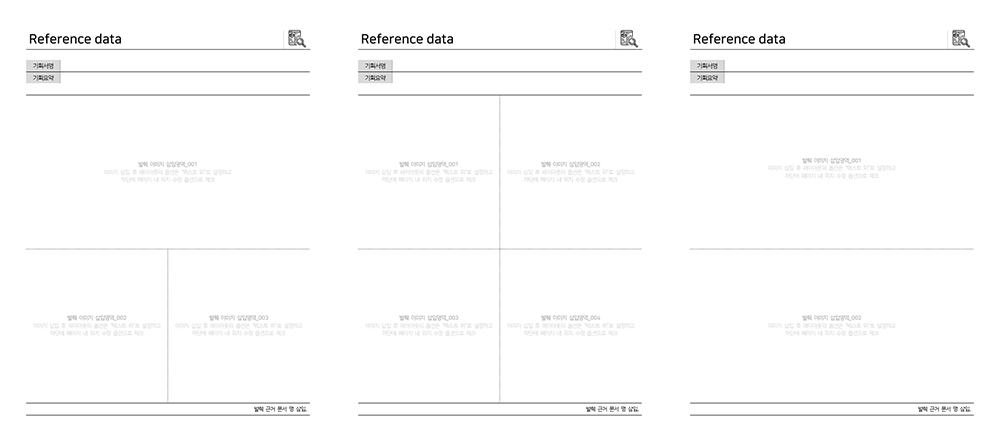 본인이 기획서를 작성할 때 어떤 생각을 가지고 기획했는지, 당시 중요하게 고려했던 지점은 무엇이 있었는지 등이 포트폴리오에 기술되어야 합니다. 그런데 그러한 부분이 배제된 채, 기획안 페이지 몇 개만 덩그러니 복붙해 놓는 정도라면 해당 내용이 무엇을 의미하는지 채용담당자는 이해할 수가 없습니다. 본 이력서 템플릿에서는 첨부하고자 하는 기획서의 제목과 개략적인 기획 이슈들을 정리할 수 있는 Form을 구성했고, 3가지 Type의 Layout을 제공하고 있으니, 적절히 배치해서 사용하시면 됩니다.