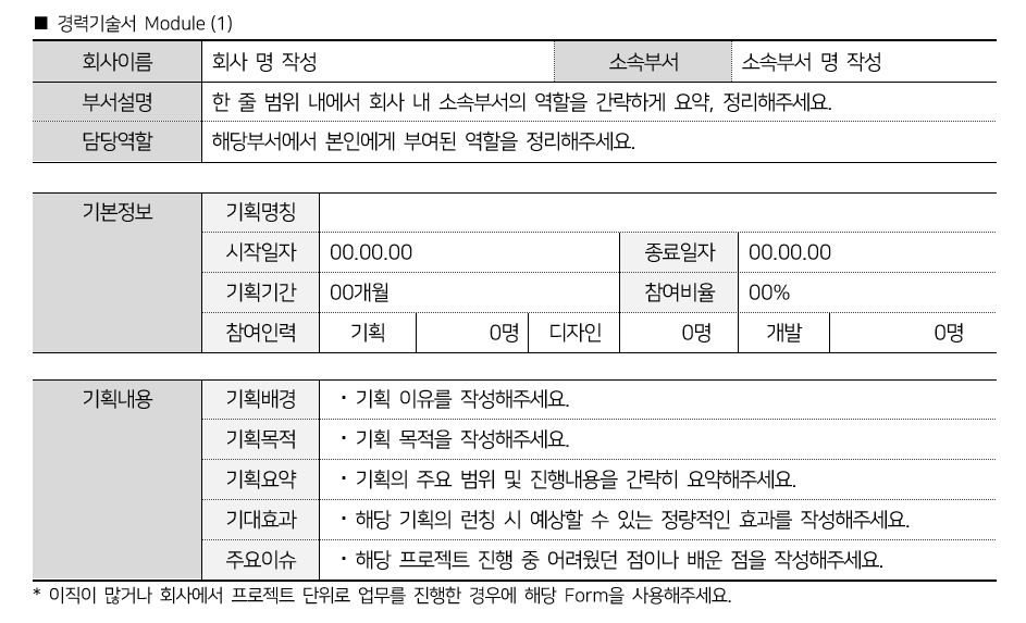 참고로 경력기술서 Module (1), (2) 모두 한 번에 몰아서 작성하기 힘든 내용을 담고 있습니다. 때문에 매 업무가 종료될 때마다 경력기술서를 업데이트하는 습관을 가지시기 바라고요, 본인이 해온 일은 본인 아니면 알 수 없다는 생각으로 꼼꼼히 정리해보시기 바랍니다.