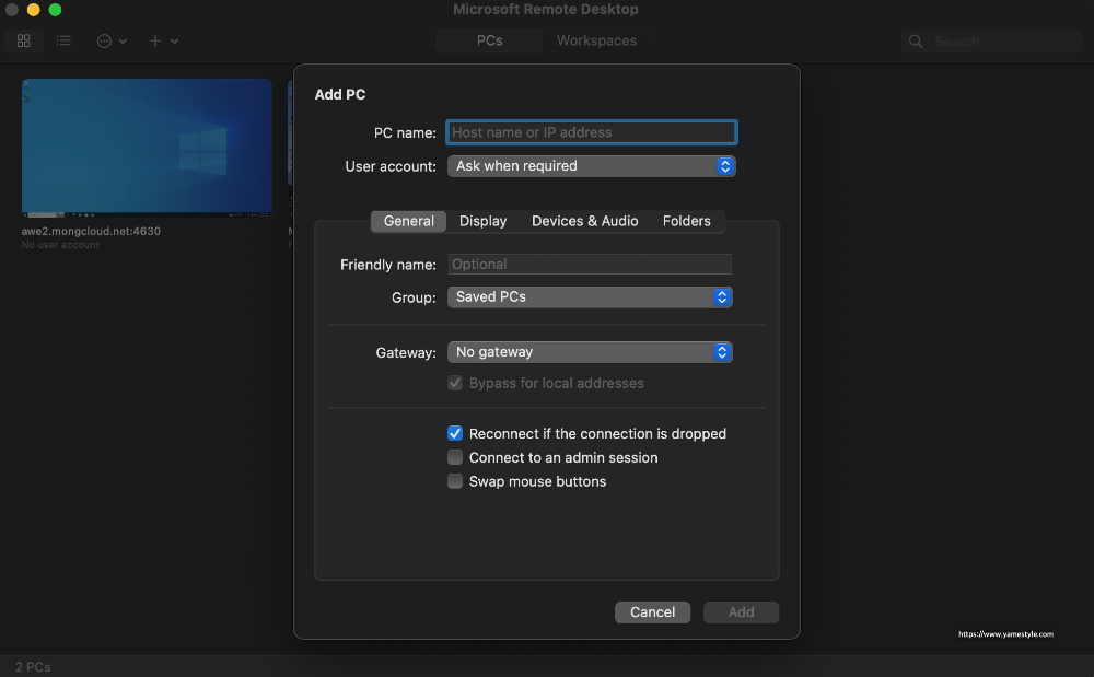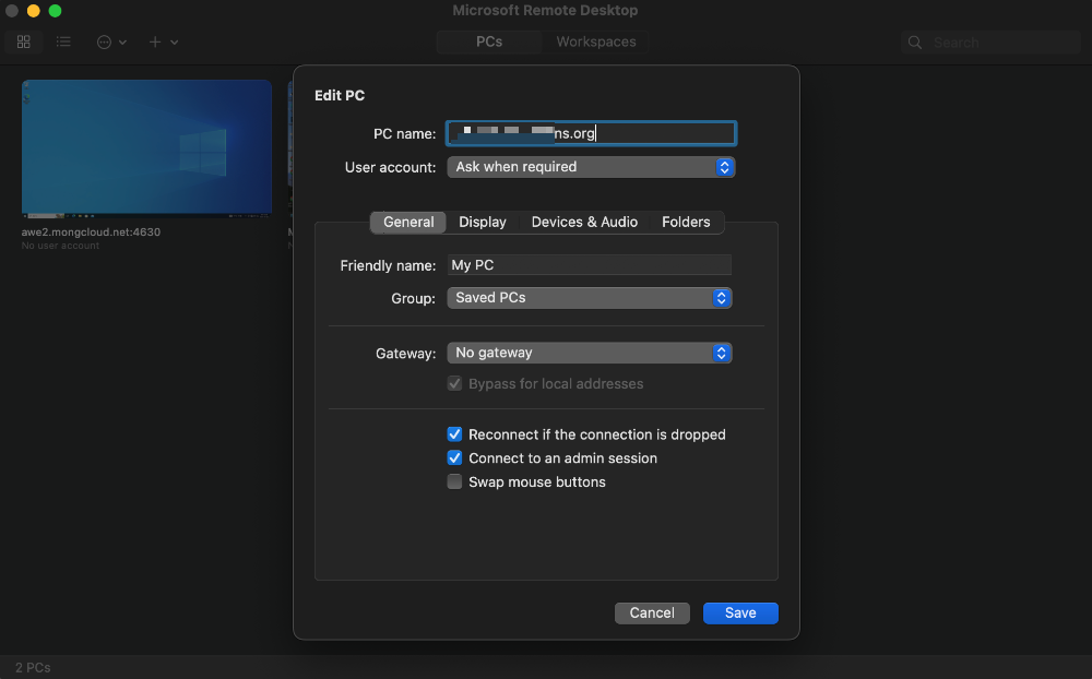 앞서 STEP. 1에서 Mircosoft remote desktop App 세팅을 간단히 해봤는데, STEP. 1에서의 세팅은 "맥과 Windows PC가 동일 네트워크 상에 위치했을 때"의 케이스이고 외부에서 집에 있는 PC에 접근하기 위해서는 등록하는 정보가 달라져야 합니다. 아래 [그림.15]처럼 PC name 위치에 컴퓨터의 이름이 아닌 no-ip.com을 통해 발급 받은 DDNS를 등록하면 모든 설정과정이 완료 됩니다. 따란!!