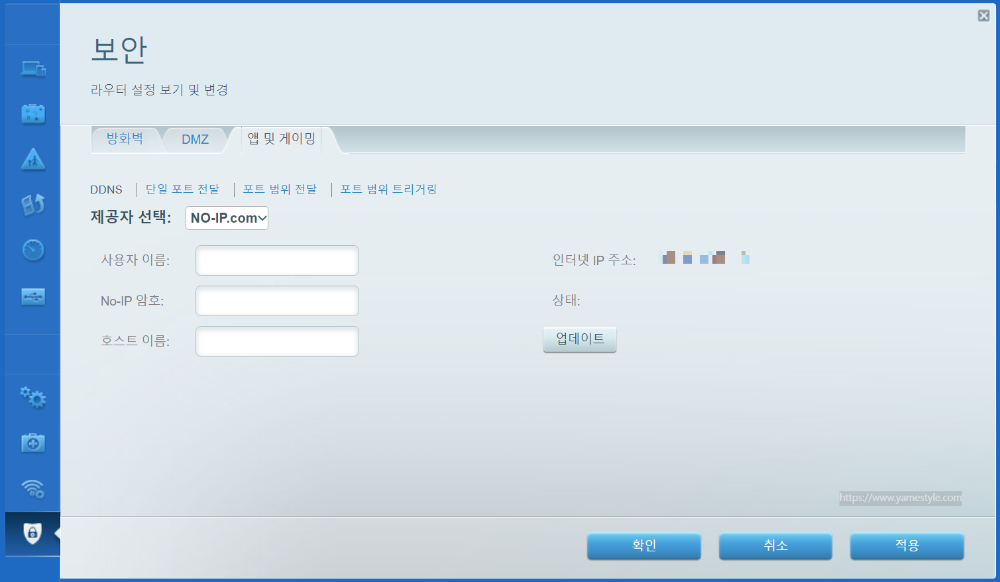 그 다음 아래의 [그림.11]의 화면에서 no-ip.com에서 가입 시 입력했던 계정 ID와 비밀번호를 사용자 이름과 NO-IP 암호 입력 란에 각각 입력하고 호스트 이름에 no-ip.com에 가입 시 입력했던 호스트 네임을 입력한 후 화면 오른쪽 하단의 적용 버튼과 확인 버튼을 차례로 클릭해주세요. 그럼 DDNS 설정 끝! 만일 설정이 잘 됐는지 확인하려면 화면의 상태 위치에 "성공" 문구가 확인된다면 완료된 겁니다.