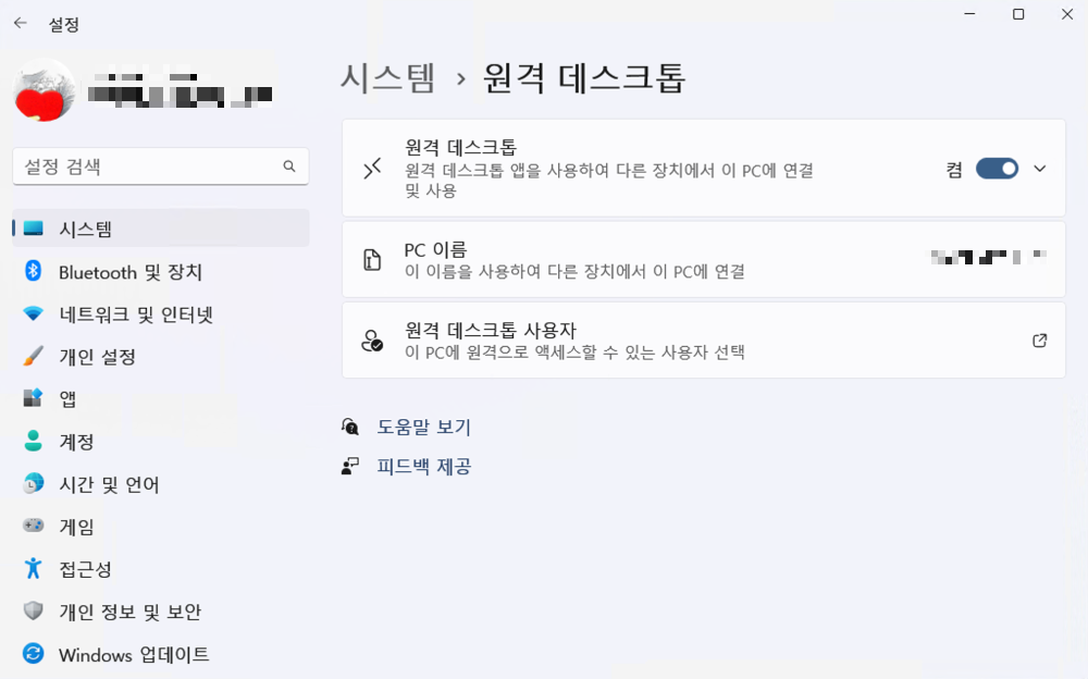 * 원격 데스크톱(remote desktop) 기능은 원칙적으로 PC에 설치된 OS가 Windows Home 인 경우는 이용할 수 없음.