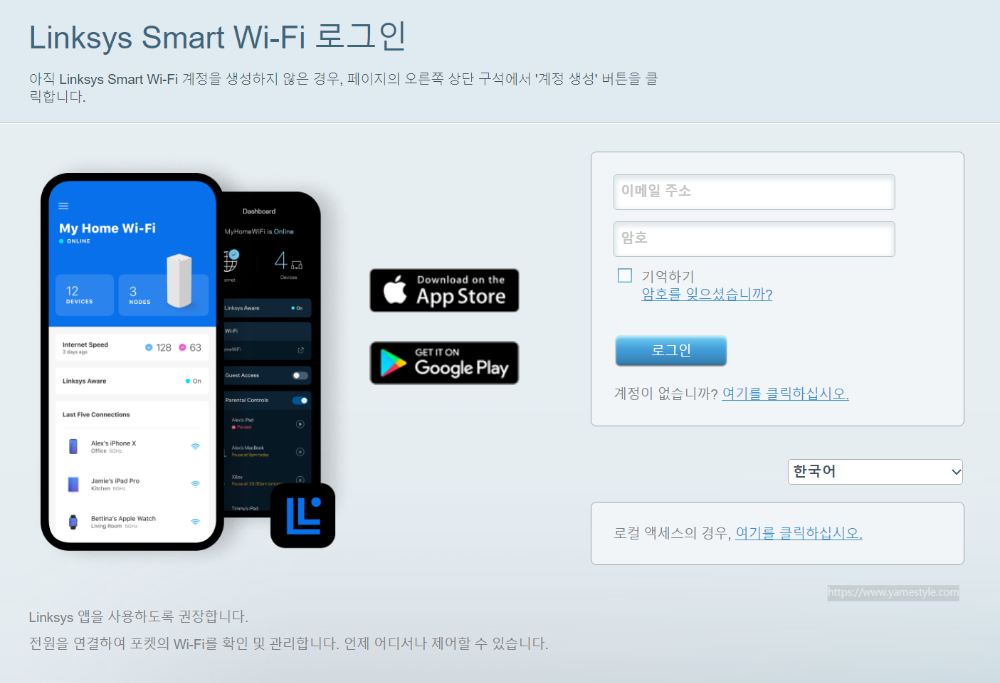 링크를 클릭하면 [그림.5]와 같은 로그인 화면으로 전환되는데, 공유기 구입 후 스마트폰의 Linksys 앱을 통해 초기 세팅 시 등록했던 e-mail ID와 Password를 입력해주세요. 만일 여기서 e-mail ID를 모르신다면... 큰일 난 겁니다. 이때는 공유기 메뉴얼을 참고하여 공유기를 초기화한 후 재설정을 하시던지 예전 메일을 싹 뒤져서 Linksys가 보낸 메일을 가입완료 메일을 찾던지 해야하고요. 비밀번호가 기억나지 않는다면 등록했던 e-mail로 비밀번호를 재설정 할 수 있습니다.