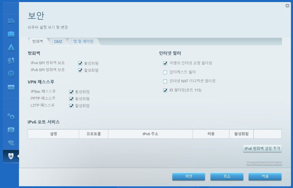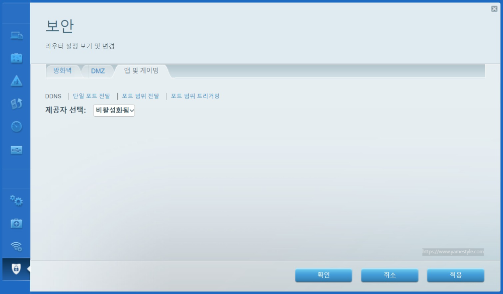 보안 화면의 상단에 있는 탭 메뉴 세 개 중 방화벽이나 DMZ는 기본 세팅을 유지하고 바로 앱 및 게이밍 메뉴를 클릭합니다. 그럼 아래 [그림.7]과 같이 DDNS 설정 화면을 확인할 수 있습니다. DDNS는 "Dynamic Domain Name System"의 약자로 대부분의 사용자가 사용하는 동적(유동) IP는 일정한 주기나 상황에 따라 변하기 때문에 DDNS 설정을 통해 변하지 않는 도메인을 만들 수가 있는데요, 나중에 안 사실이지만 DMZ 기능을 통해 PC에 접속할 수 있는 고정 IP를 만들 수도 있지만, 제가 안 해봤으므로 이건 패스할게요.ㅎㅎㅎ