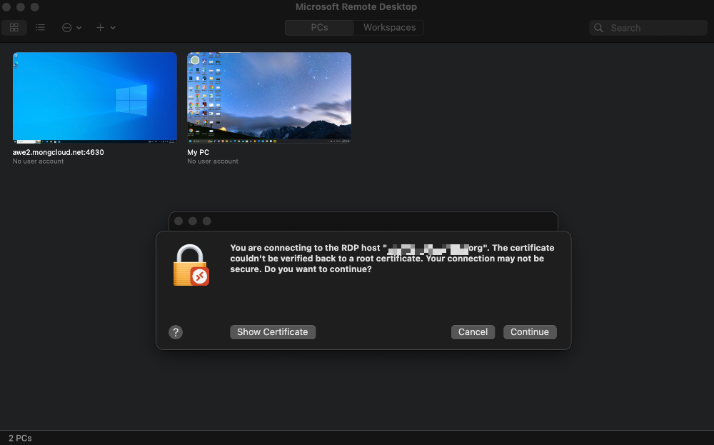Windows OS에서는 이러한 메시지가 나오지 않도록 설정하는 방법이 있는데 맥에서는 잘 모르겠네요. 여하튼 이런 메시지가 나온다고 안전하지 않은 건 아니니 무시하시고 "Continue" 버튼을 클릭하면 기대했던 내 PC의 바탕화면이 진짜 짠!! 하고 호출되는 것을 확인할 수 있습니다. 어때요? 확인하셨나요?