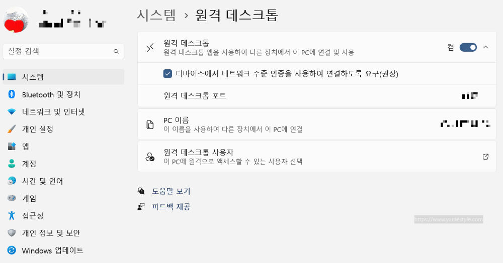 PC 세팅은 의외로 간단합니다. "설정>시스템"(Windows 11 Pro 기준) 메뉴에서 스크롤을 내려 "원격 데스크톱" 메뉴를 눌러 토글 버튼을 켬으로 설정해주면 끝!! (토글 메뉴 옆에 ∨ 버튼을 눌러 해킹의 위협을 줄일 수 있도록 "디바이스에서 네트워크 수준 인증을 사용하여 연결하도록 요구" 항목을 체크)