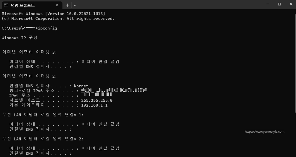 여기서 입력 창에 ipconfig를 입력 후 엔터 버튼을 누르면 주르륵 정보가 출력되는데, 이 중 IPv4 주소 항목에서 확인된 12자리 숫자를 Linksys 설정 내 보안>앱 및 게이밍>단일 포트 전달 등록 화면에서 장치 IP에 입력하고(보통 192.168.x.x와 같은 IP를 확인할 수 있는데, 세 번째와 네 번째 x에 해당하는 숫자만 입력하면 됩니다.) 활성화됨에 체크를 해준 후 적용 버튼과 확인 버튼을 각각 순서대로 클릭해주세요. 여기까지 완료했다면 외부에서 집에 있는 PC에 원격으로 접속할 수 있는 환경이 갖춰진 겁니다!!