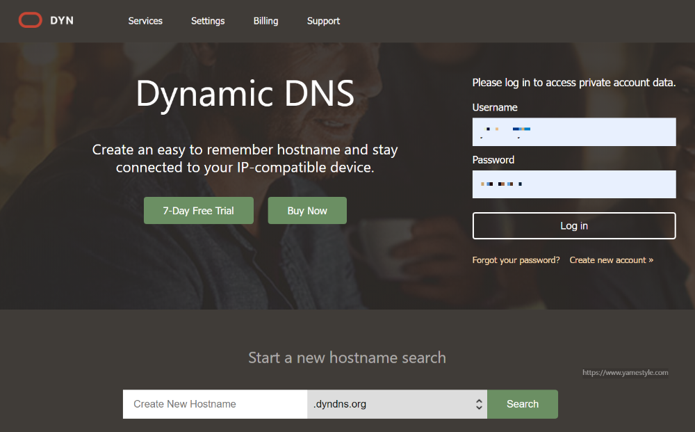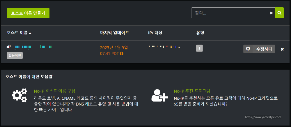 아! 이것도 나중에 안 사실이지만, dyn.com은 유료 구독 서비스(연간 $55)만 제공하고 no-ip.com의 경우 유료와 무료 두 가지 서비스를 제공합니다.(빡친다!! 난 dyn.com에서 결제했다고!!) 무료는 일부 기능 제한 및 광고가 노출되고 유료인 경우에도 dyn.com 보다 절반 정도인 연 $23.88 정도이니 no-ip.com에서 먼저 무료로 계정을 만든 후 필요하다면 유료로 전환해도 될 것 같습니다. 영어가 익숙하지 않다면 구글 번역 기능을 통해 서비스를 한국어로 바꾸면 좀 더 수월하게 가입하실 수 있겠네요.