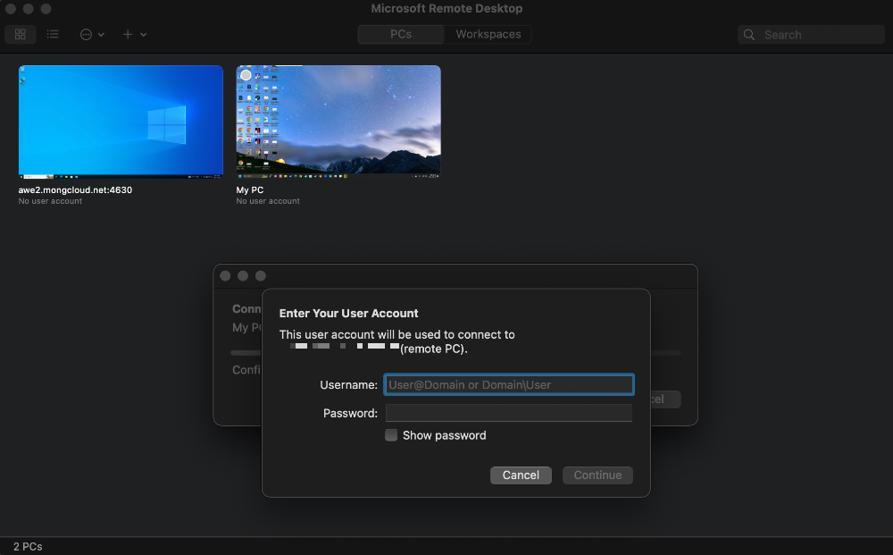 앱에 생성된 화면을 더블 클릭하면 PC의 로그인 ID와 Password를 입력하라는 창이 나오고 여기에 입력하고 확인 버튼을 누르면 바로 Windows 화면이 나옵니다.(매번 ID와 Password 입력이 번거롭다면 User account에서 "Add User Account..."를 선택하면 ID와 Password를 미리 입력해둘 수 있습니다.)