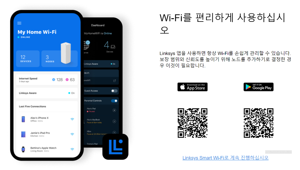 하지만 여차 저차 해결을 했습니다.(무려 6시간이나 걸려...) 차근차근 따라해보세요. 먼저 공유기의 관리환경을 접속해야 합니다. 브라우저를 실행 후 주소 창에 192.168.1.1를 입력하면 [그림.4]와 같이 초기 화면이 나오는데, 화면 우측 하단에 "Linksys Smart Wi-Fi로 계속 진행하십시오" 링크를 클릭하세요. (IPTIME 공유기에 익숙하신 분들은 본능적으로 192.168.0.1을 입력하실지도..)