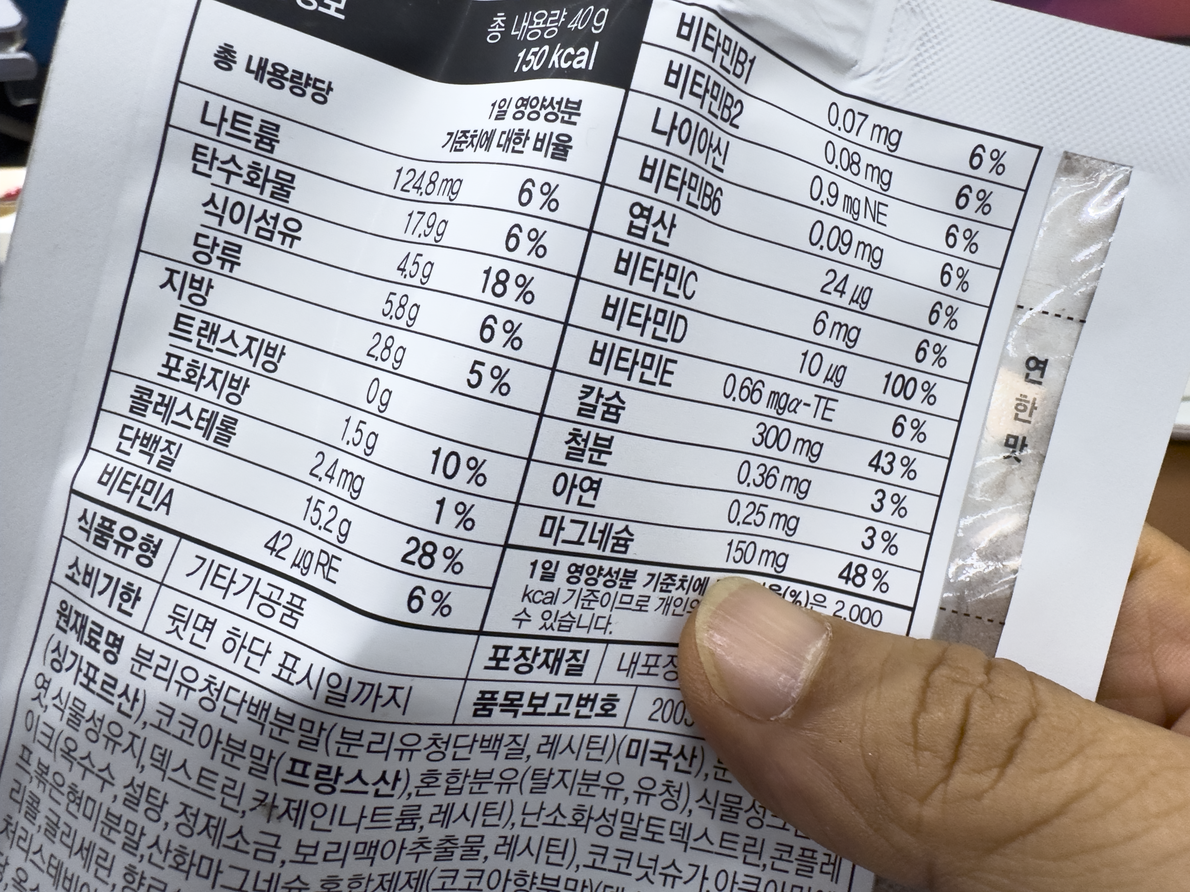 그런데 웬걸? 150kcal(40g)의 열량을 제공하는 한 포에 불과 5%에 불과한 낮은 수준의 당이 포함되어 있더군요! 거기에 단백질과 비타민 A, B, C, D, E에 콜레스테롤을 낮추는데 도움을 주는 나이아신과 엽산(임산부만 먹는 비타민인 줄...), 칼슘, 마그네슘 등이 고르게 담겨있음을 알 수 있었습니다. 이 정도라면 운동 직전이나 직후에 챙겨 먹어도 괜찮겠다 싶어, 바로 두 세트(14개)를 주문했고 제품이 도착한 당일부터 아침 출근길에 하나, 저녁 운동 전에 각각 하나씩을 우유에 타서 먹게 되었습니다.