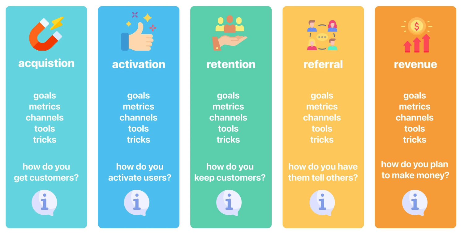 AARRR은 획득(Acquisition), 활성화(Activation), 유지(Retention), 추천(Referral), 수익(Revenue)의 영단어의 앞글자를 따서 만들어졌습니다. 이는 성장에 포커스를 맞춘 온라인 기반의 스타트업이 집중해야할 다섯 가지 지표로 신생 기업이 추적할 수 있는 방대한 메트릭 배열을 단순화하고 성과의 우선 순위를 지정하는 방식입니다. AARRR 프레임워크의 단순성과 직설적인 접근 방식은 스타트업 뿐만 아니라 기존 온라인 비즈니스를 운영 중인 기업에서도 범용적으로 활용되고 있는 추세 인데요, 그럼 AARRR을 구성하고 있는 다섯 가지의 지표인 획득, 활성화, 유지, 추천, 수익에 대해서도 알아볼게요.
