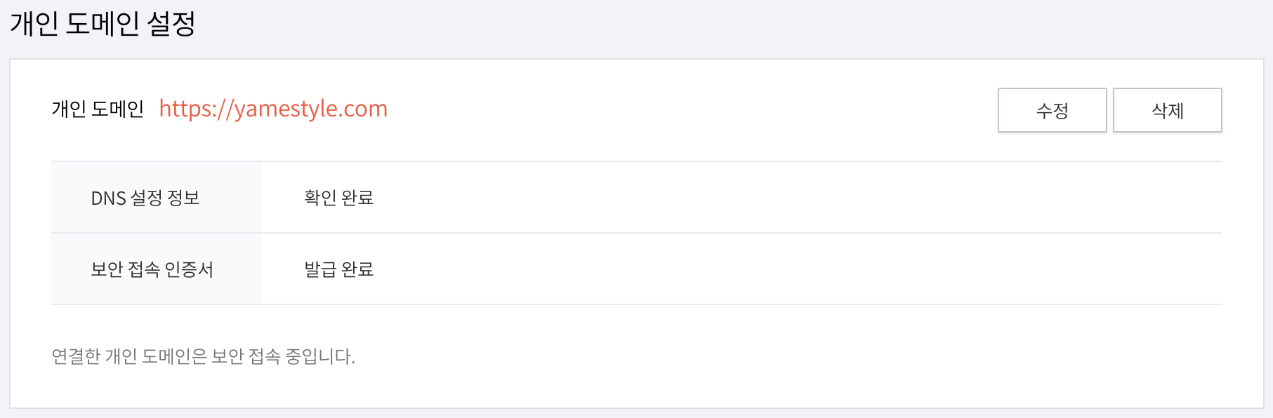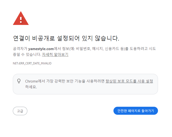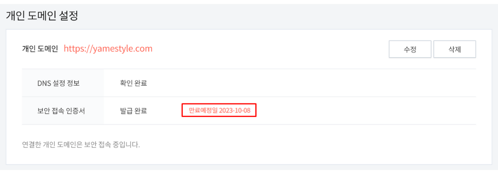 떨리는 마음으로 삭제 버튼을 누르고 yamestyle.com 도메인을 재등록한 후 하루가 채 지나지 않은 시점, 다행히도 yamestyle.com 도메인으로 정상 접속이 되었습니다. 그리고 심장이 덜컥했던 빨간딱지도 싹 사라진 상태. 만일 운영 중인 사이트에 "NET::ERR_CERT_DATE_INVALID" 경고가 뜬다면 SSL 인증 만료일 가능성이 높으니, SSL 인증서의 갱신을 통해 문제를 깔끔하게 해결해 보세요. 물론 일이 벌어지기 전에 대응하는 것이 최선의 방법이겠지만 말이죠.