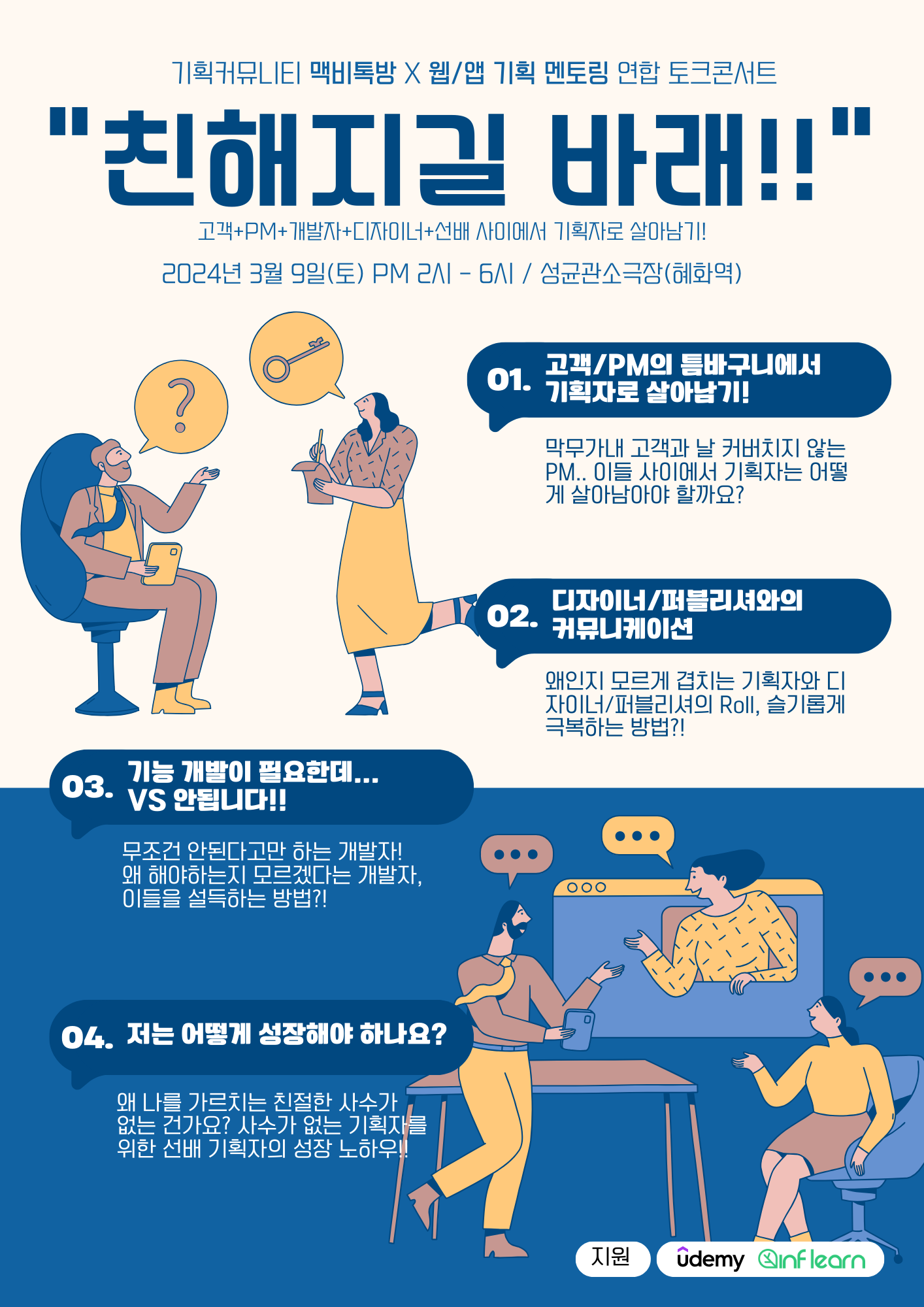 오는 3월 9일(토)에 대학로 인근 소극장에서 맥비톡방(맥비)과 기획 멘토링방(노노니)의 연합 토크콘서트 "친해지길 바래"행사가 진행됩니다. 고객과 PM, 개발자와 디자이너 사이에서 기획자로 살아남는 방법과 더 나아가 성장의 발판을 만들 수 있는 선배 기획자의 숨겨둔 인사이트를 공유합니다. 총 4개의 세션으로 운영되는 이번 행사에는 맥비톡방을 운영하시는 맥비님과 기획 멘토링방을 운영하시는 노노니님 그리고 IT 입문자를 위한 유튜브를 운영하고 계신 불꽃남자님과 저 야메군이 스피커로 참석하고요, 여러분들의 고민을 함께 나누고 해법을 같이 고민하는 시간이 되면 좋겠습니다.