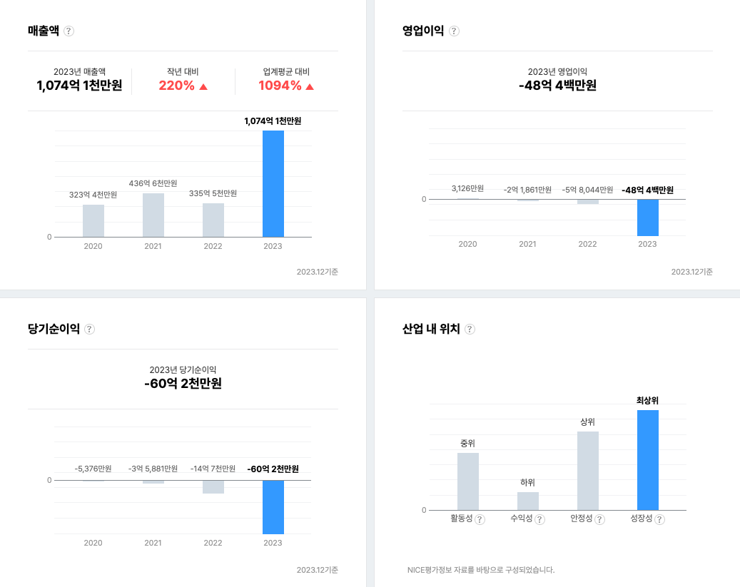 이와 같은 과정 속에 유통 대기업의 인프라에 힘입어 외형 상의 사이즈는 급속하게 성장했으나 영업이익의 적자 규모 역시 비례하는 상황. 2023년 매출이 1,074억에 달하고 성장율도 무려 220%에 달했으나 2023년 들어 영업이익의 적자는 전년도 대비 무려 -727.64%에 달하고 당기순이익 역시 -241.49%에 이르렀습니다. 2023년 데이터로 미루어볼 때 2024년엔 그 폭이 더 증가했으면 증가했지 줄지는 않았을 것으로 봅니다.