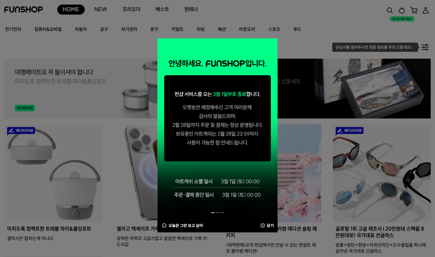 오랜만에 남기는 콘텐츠의 아젠더가 참으로 우울하네요. 그간 버티컬 커머스의 대명사로 30~40대 남성들의 구매욕을 자극하던 신박하고 참신한 아이템을 판매하던 펀샵(funshop.co.kr) 서비스가 2025년 2월 28일자로 20여년 간의 긴 여정을 마무리한다는 공지사항이 떴습니다. 사실 전 이런 일이 있을 줄 전혀 예상하지 못했습니다. 고객센터의 업무시간 축소, 주요 프로모션 스토어의 재정비를 명목으로한 종료 소식을 들었음에도 말이죠..