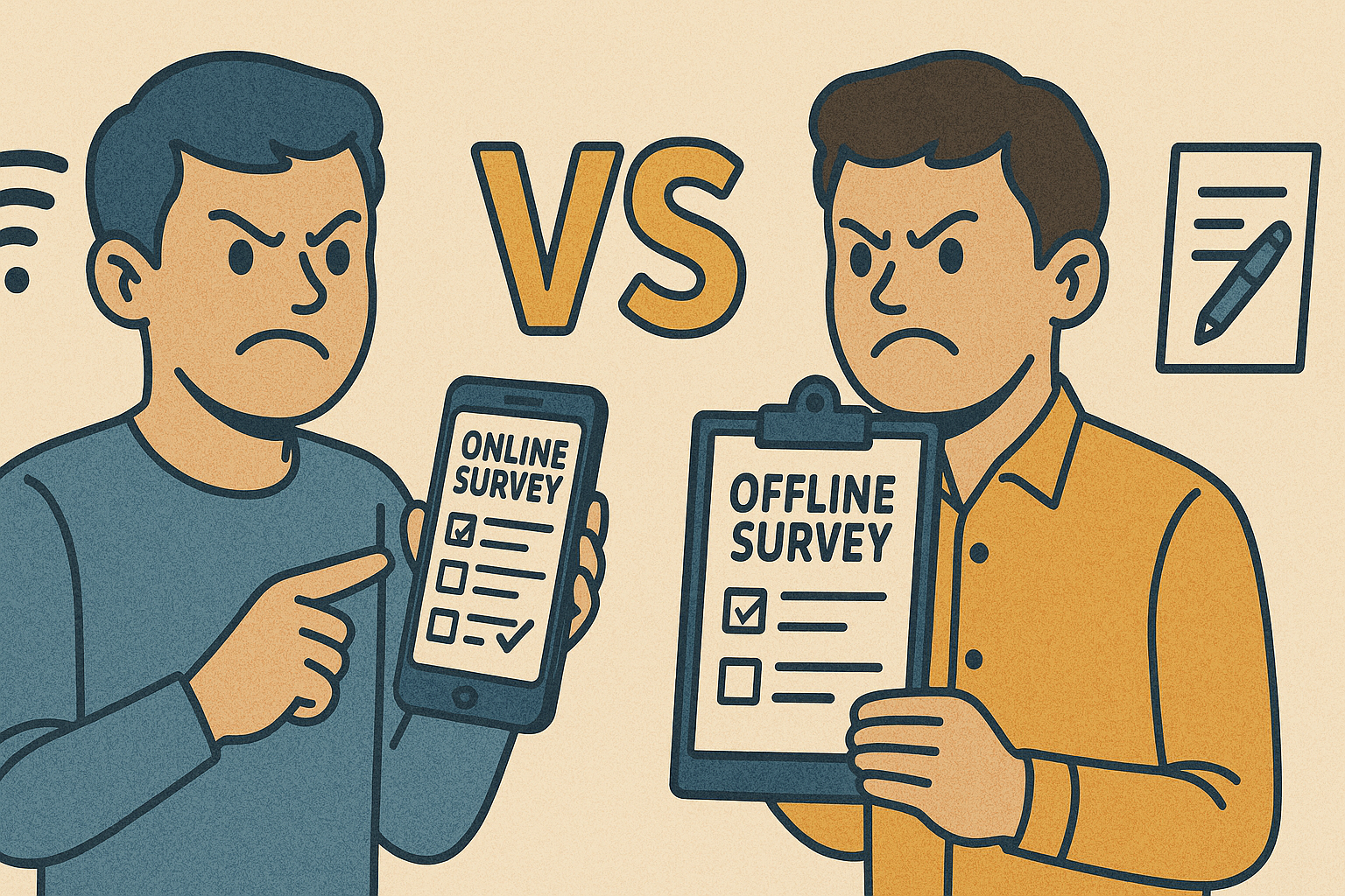 반면, 오프라인 설문조사는 크게 단순 대면 방식과 인터뷰 방식으로 구분됩니다. 단순 대면 방식은 현장에서 직접 설문지를 배포하여 응답을 받는 방식으로 응답자의 생생한 반응과 의견을 얻을 수 있습니다. 인터뷰 방식은 일대일 또는 소규모 그룹 인터뷰(Focus Group Interview)를 통해 심층적인 정보를 수집하는 방법으로 응답자의 의견과 감정을 파악하는데 유용합니다. 깊이 있는 정보와 정성적 감정을 얻는 데 유용합니다. 소개한 두 가지의 오프라인 설문조사 방식은 온라인 방식에 비해 많은 비용과 시간이 소요되는 것이 일반적이며 응답자 수 역시도 상대적으로 제한적일 수밖에 없는 한계가 있습니다. 차후 기회가 된다면 인터뷰 방식의 대표 격인 FGI와 FGD(Focus Group Discussion)에 대해서도 자세히 다뤄보도록 하겠습니다.