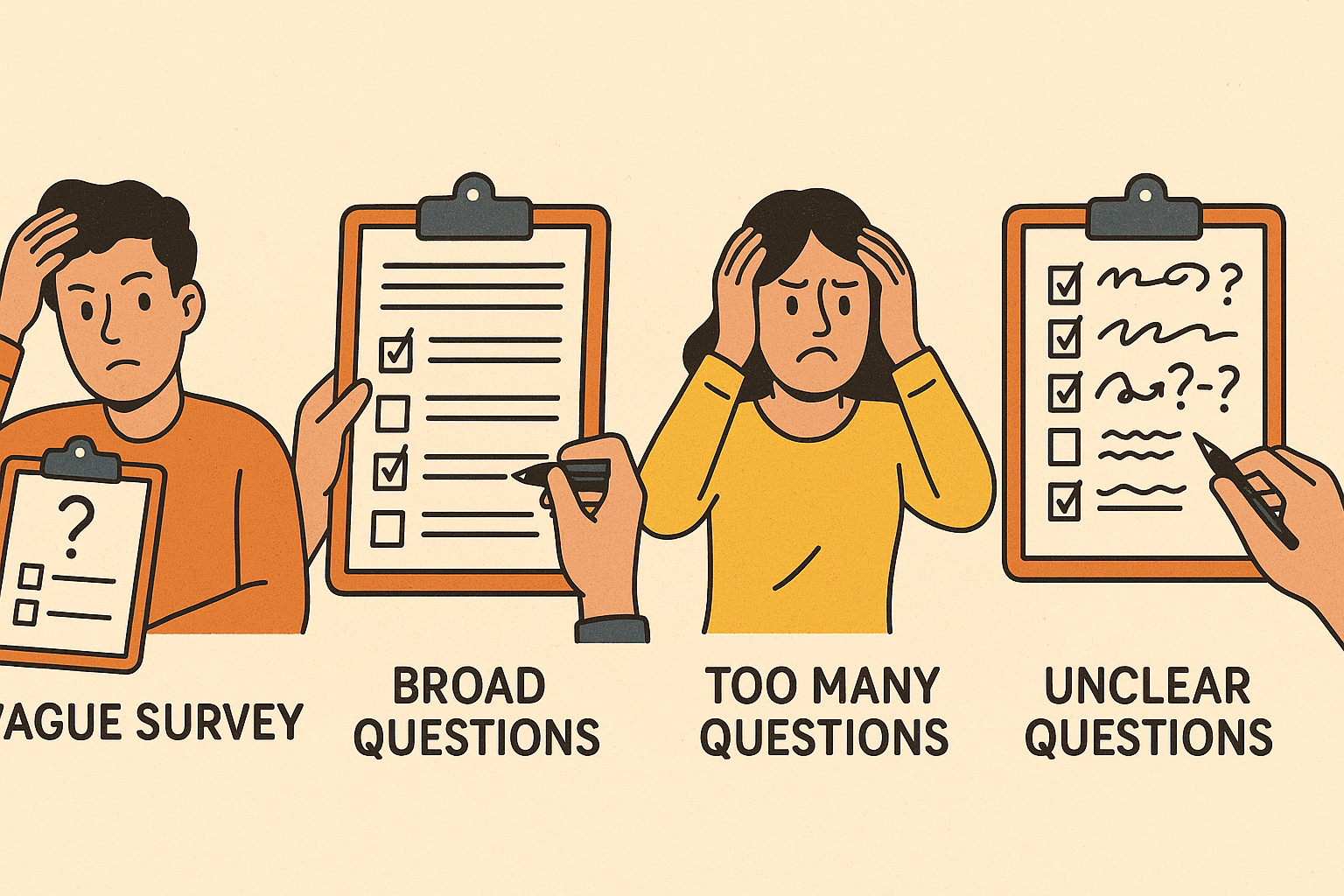 많은 설문조사를 살펴보다 보면 공통적인 실수가 종종 눈에 띄는데요. 그 대표적인 케이스로 설문 목적이 명확하지 않거나 너무 넓게 잡으면 응답자들이 질문을 이해하지 못하거나 혼란을 느끼게 만드는 경우일겁니다. 질문 수가 지나치게 많으면 응답자는 피로감을 느껴 설문을 중도에 포기하거나 집중력을 잃어 결과의 신뢰도에 영향을 미칠 가능성이 높아집니다. 반면 질문이 너무 적으면 충분한 데이터를 확보하지 못할 수 있죠.