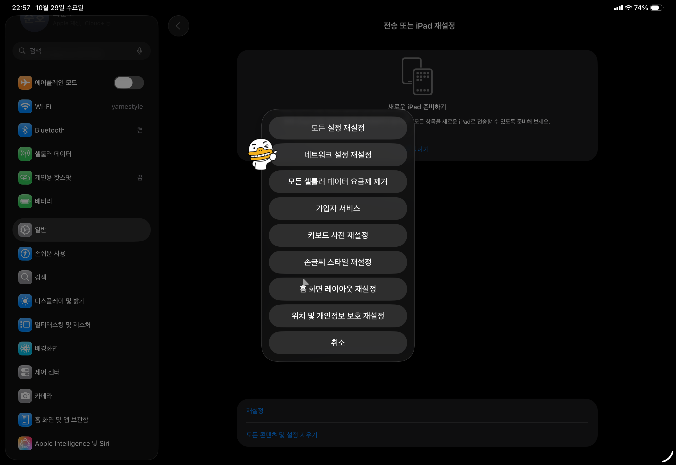 이 얇은 귀.. 능수능란한 상담사의 사탕발린 꼬심에 저도 모르게 넘어가버렸고, 문뜩 인터넷 속도가 느린 문제가 떠올라 이를 물어보니, 아.. 그거 네트워크 재설정 한 번 해보라는 피드백을 받았습니다. 꽤 많은 분들이 이걸로 속도를 회복했다나 뭐라나.. 보통 기기를 초기화할 때 전체를 재설정하는 기능(포맷이죠.)은 이용해봤지만, 이와 같이 부분적으로 재설정하는 기능은 사용해보지 않았기에 메뉴 위치를 물어보고 재설정 시 통신사 요금제를 다시 등록해야 하는지 등을 체크한 후 네트워크 재설정 버튼(튜브 캐릭터가 있는 버튼)을 과감히 눌러버렸습니다.
