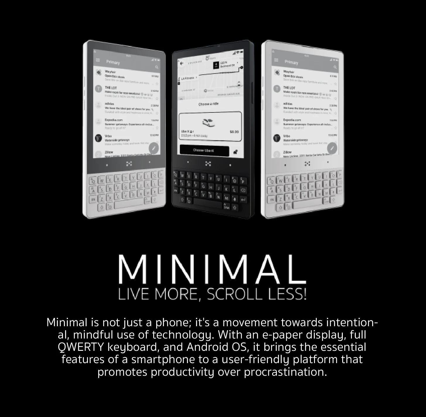 E-Ink 디스플레이와 쿼티 키보드가 달린 스마트폰. 펀딩 일자는 2024년 3월 18일. 350달러 펀딩. 이 글을 쓰는 2025년 10월 30일 현재까지 한 달에 한 번 꼴로 여러 차례 이메일을 주고 받았습니다. 처음엔 내가 색상을 선택하지 않아서 배송이 지연되었다고 해서 원하는 컬러를 알려줬습니다. 그 후 언젠가부터는 한국 배송을 위한 개인통관고유번호와 한국어 이름과 주소가 없어서 배송이 안되었다고 하더니 지금은 제가 원하는 컬러의 재고가 없답니다. 그래서 생산까지 시간이 걸린다는군요.