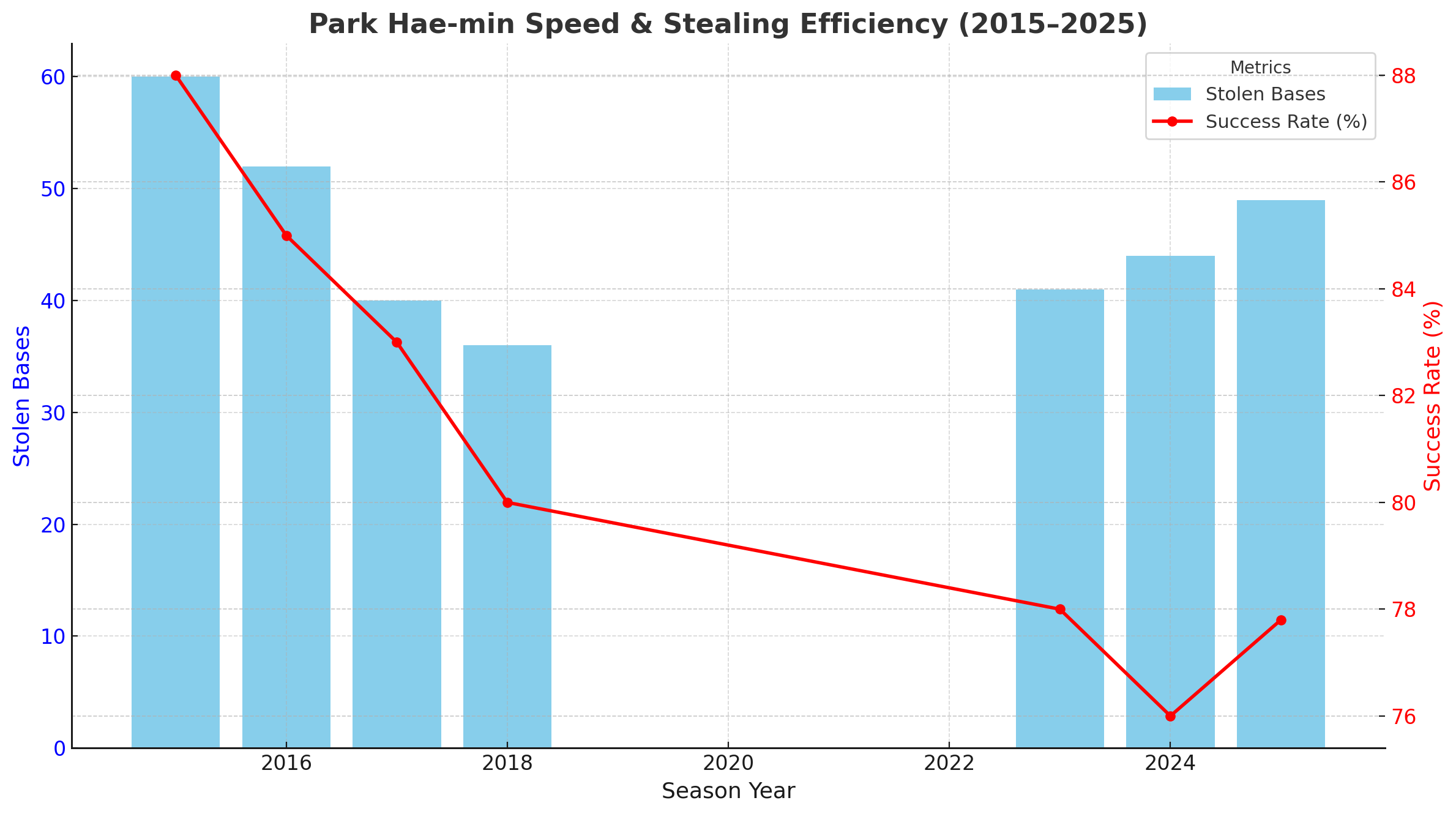 박해민의 가치는 ‘수비’라는 단어로 설명됩니다. 2025시즌에도 그는 144경기 전 경기 출전, 실책 단 1개, **49도루(성공률 77.8%)**를 기록하며 리그 정상급 외야수임을 입증했습니다. 넓은 잠실 외야를 커버하는 그의 수비 범위는 여전히 KBO 최고 수준으로 평가받고 있습니다.